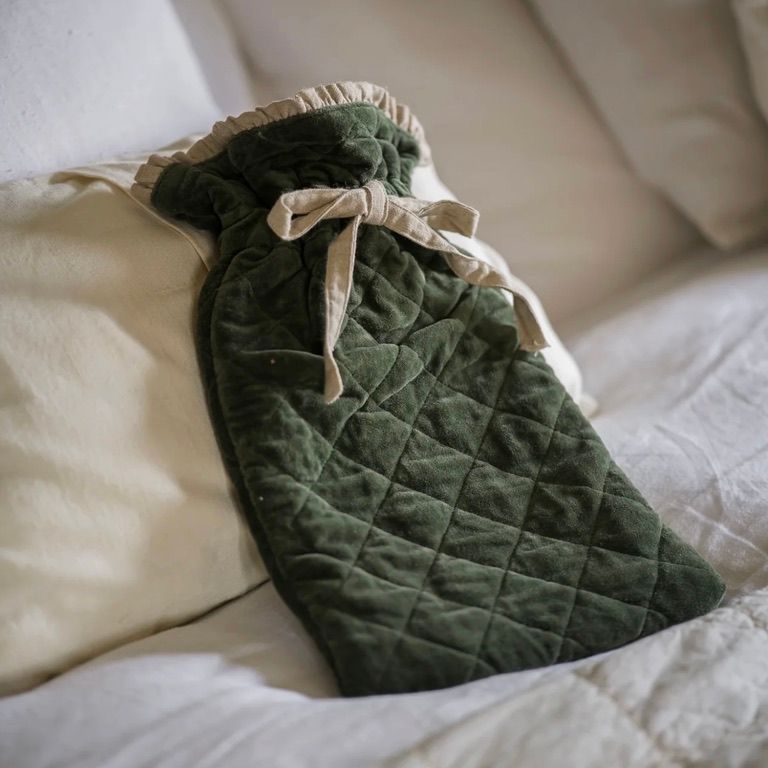 These gorgeous hot water bottles are made from the softest, 100% cotton velvet, in the most lovely moss colour. The pretty, vintage inspired linen look frill and trim make this a hot water bottle that looks as beautiful as it is warming.