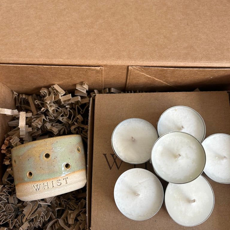 This gift set contains a tealight holder in the gorgeous green and sandy glaze, and 9 scented tealights in the essential oil blend of your choice. All boxed beautifully, ready to hand over to the lucky recipient